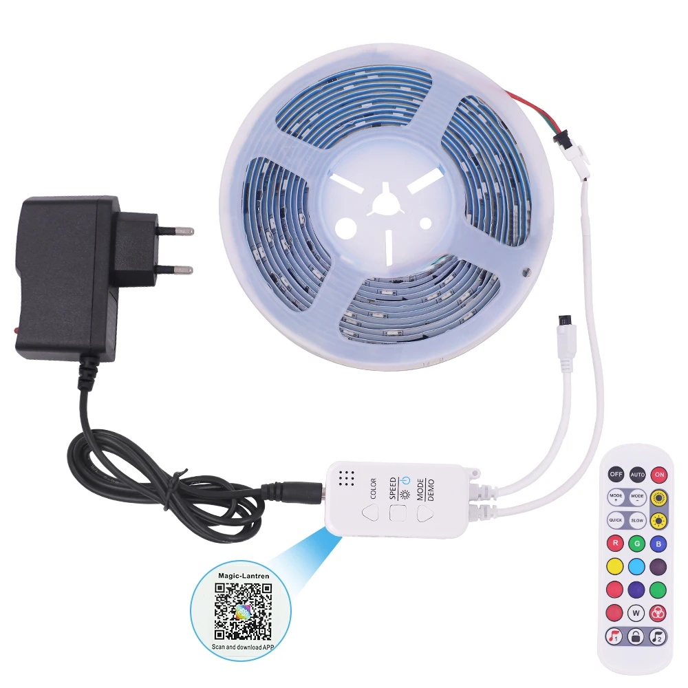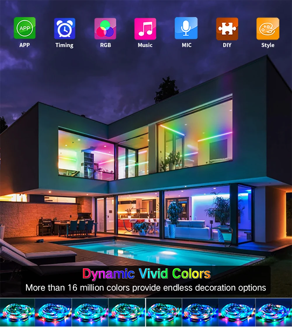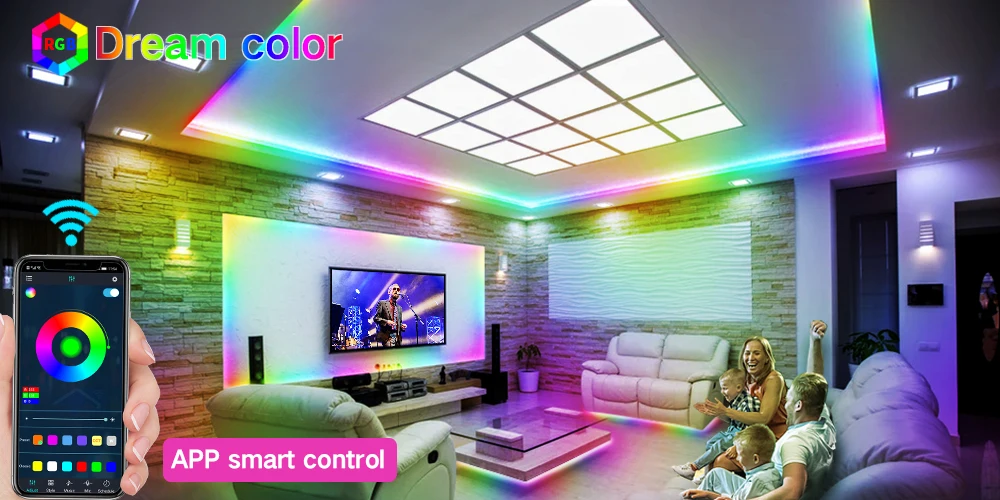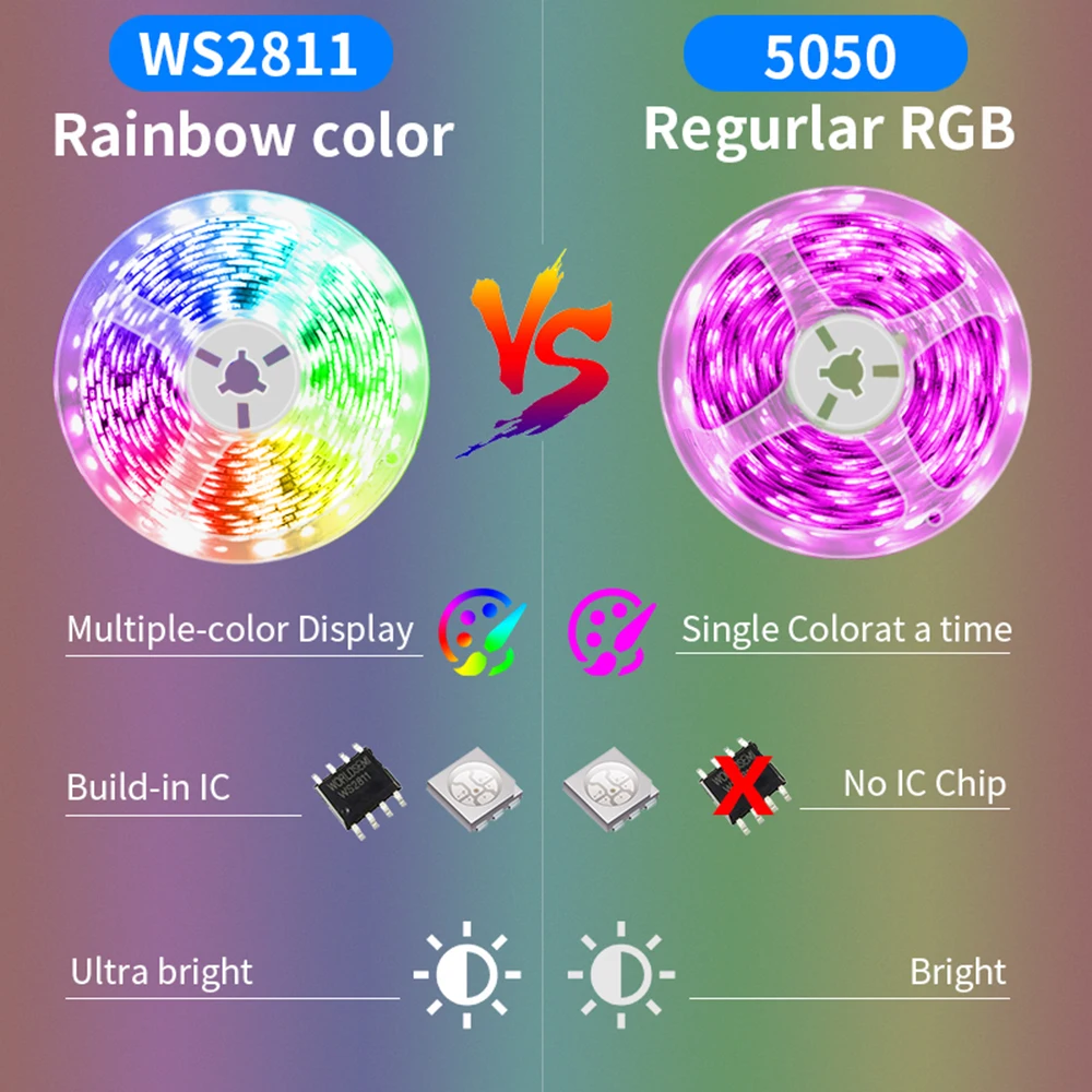 ●Dream color LED Strip: Our led music lights adopt advanced IC chips able to display Multicolors at one time like a rainbow ,there are chasing,jumping,flashing effects.More fancy and bright than RGB LED lights.
