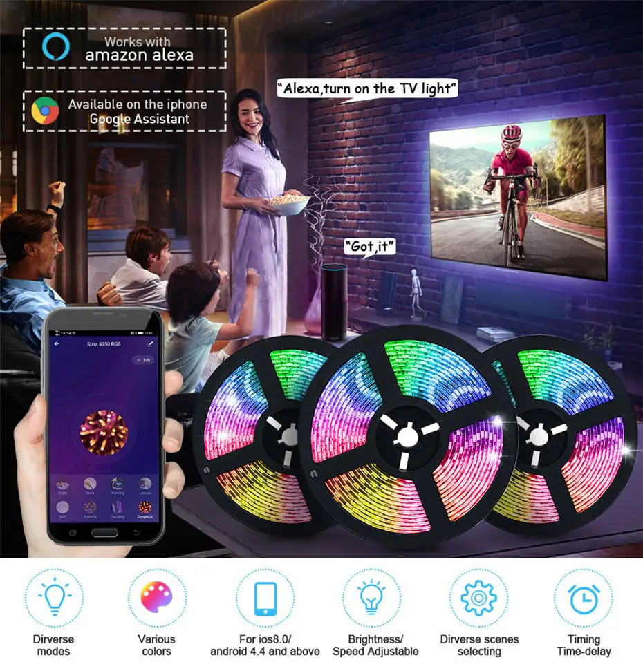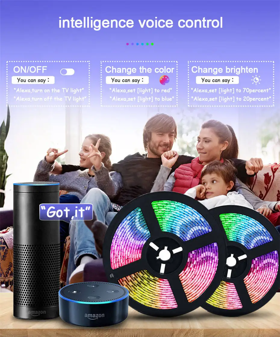 【Voice Control via Alexa & Google Assistant】LED strip lights frees your hands and no need move.Use simple dialog starters to turn lights on and off, and set colors to make them brighter or dimmer.Currently compatible with Echo and Google Home.